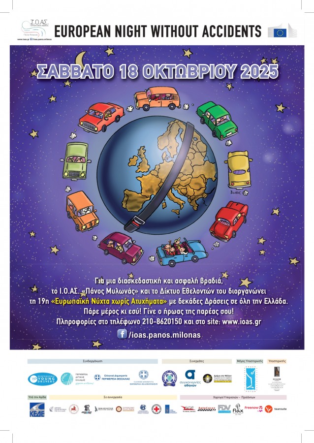 Για 19η συνεχή χρονιά, το Ινστιτούτο Οδικής Ασφάλειας (Ι.Ο.ΑΣ.) «Πάνος Μυλωνάς» υλοποίησε, το Σάββατο 18 Οκτωβρίου, τη μεγάλη πανελλαδική εκστρατεία ευαισθητοποίησης «Ευρωπαϊκή Νύχτα χωρίς Ατυχήματα» σε 37 πόλεις σε όλη τη χώρα (34 στην Περιφέρεια και 3 στην Αττική: Αθήνα, Πειραιάς, Χαλάνδρι), με τη συμμετοχή και ενεργοποίηση περισσότερων από 800 εθελοντών του Δικτύου μας. Στόχος της δράσης είναι η πρόληψη των τροχαίων δυστυχημάτων εξαιτίας της κατανάλωσης αλκοόλ μέσω του ορισμού του «Οδηγού της Παρέας».